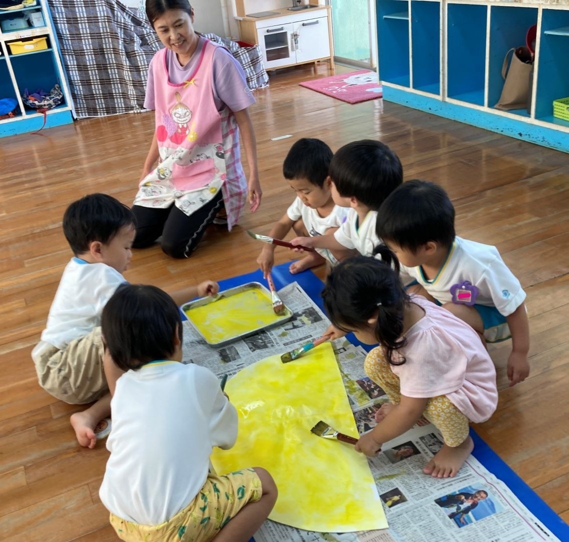 みんな真剣な表情です😆好きな色をたくさん使う子、カラフルにする子🌈、雨を降らせてみる子☔、思い思いに描きました!