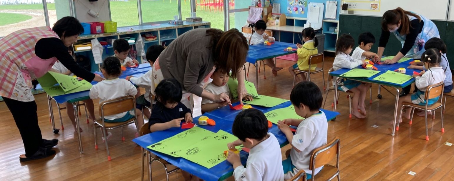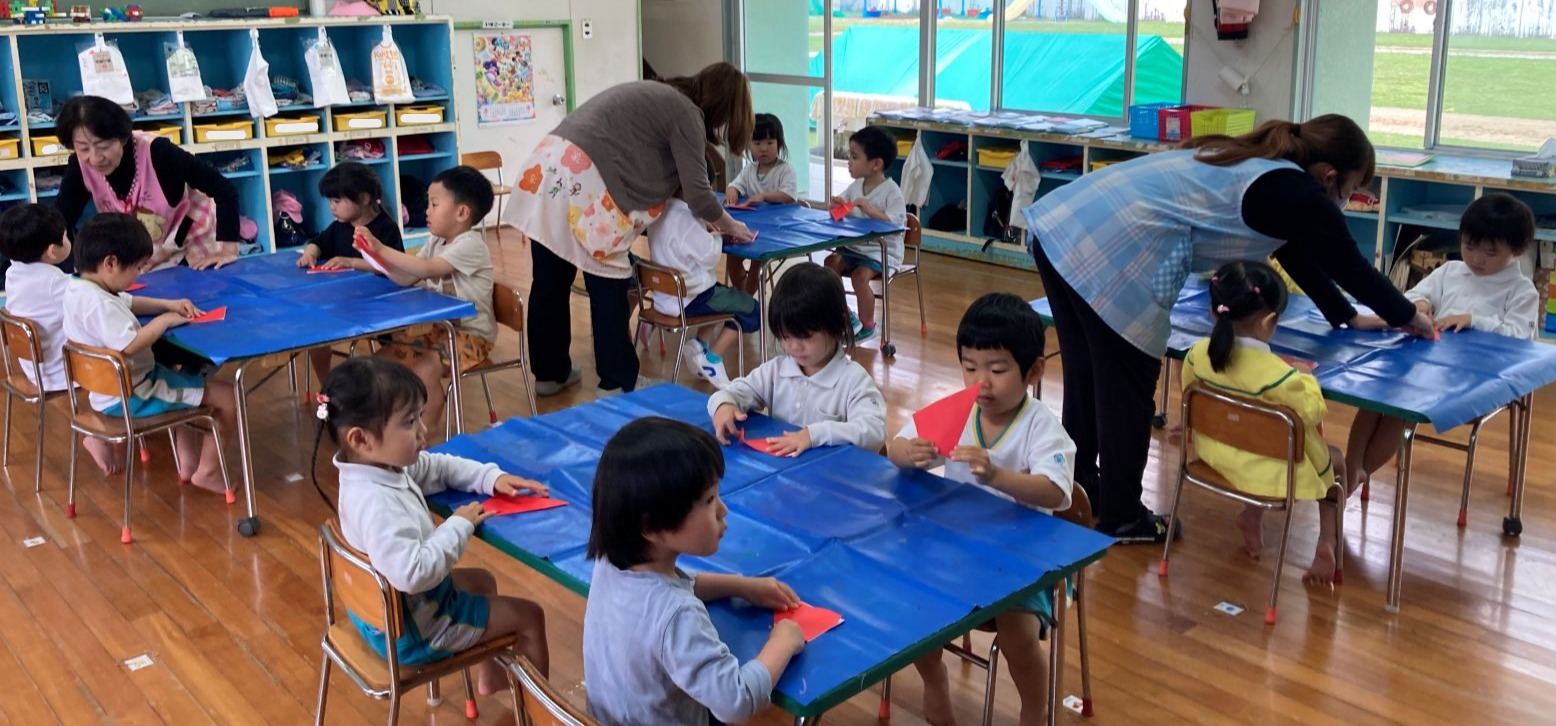 もも組(年少)さんの折り紙を使った制作活動の様子です。