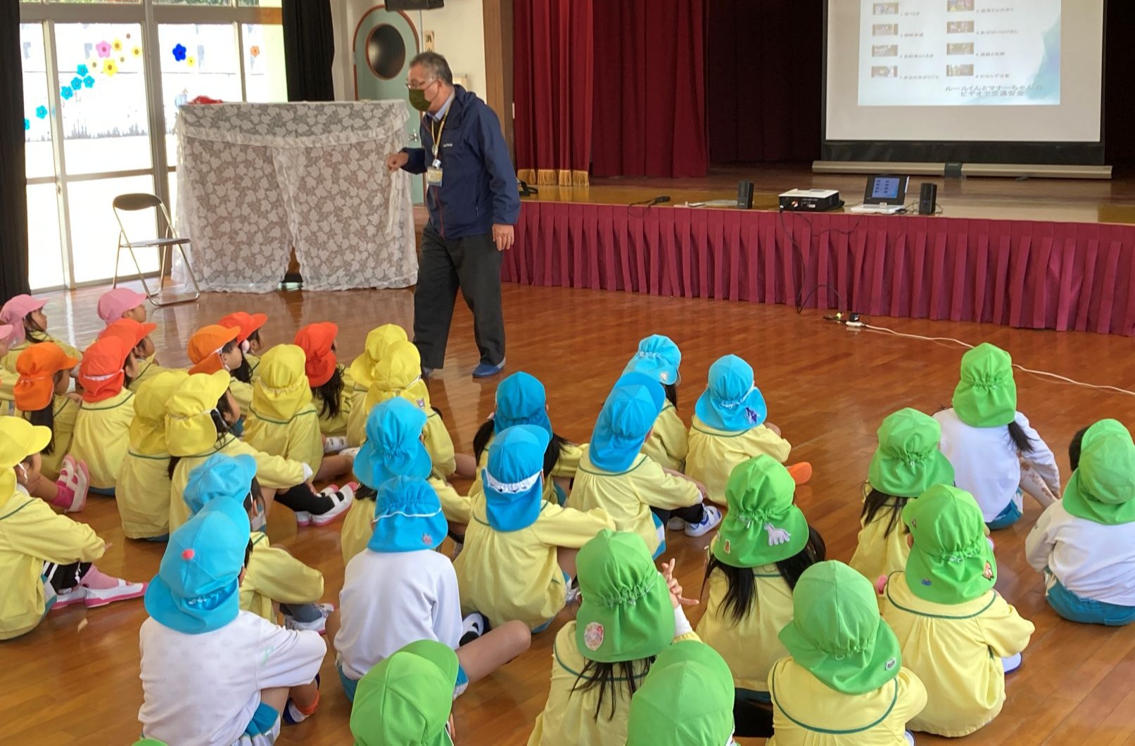 7月5日(月)の交通教室は、南さつま市の指導員と交通安全協会から3名が来られて、交通安全の勉強をしました。 指遊びをしたりクイズ形式でキャベツの中に隠れているのが何かを当てたりしながら信号について楽しく学びました。腹話術 […]